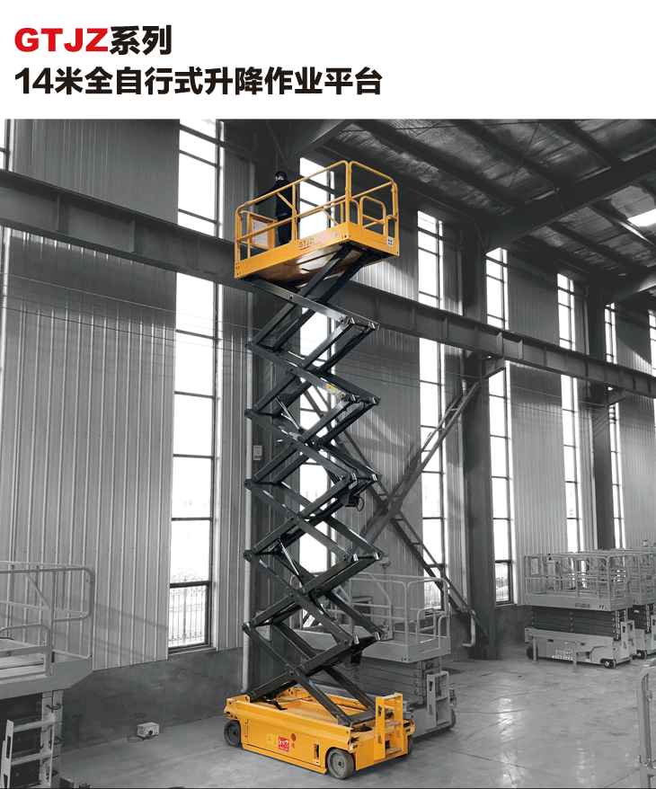 自行式高空作業平臺,它具有自動行走的功能,能夠在不同工作狀態下,快速、慢速行走,只需一個人操作便可在空中連續完成上下、前進、后退、轉向等所有動作。特別適合于機場候機樓、車站、碼頭、商場、體育場館、小區物業、廠礦車間等較大范圍的作業。